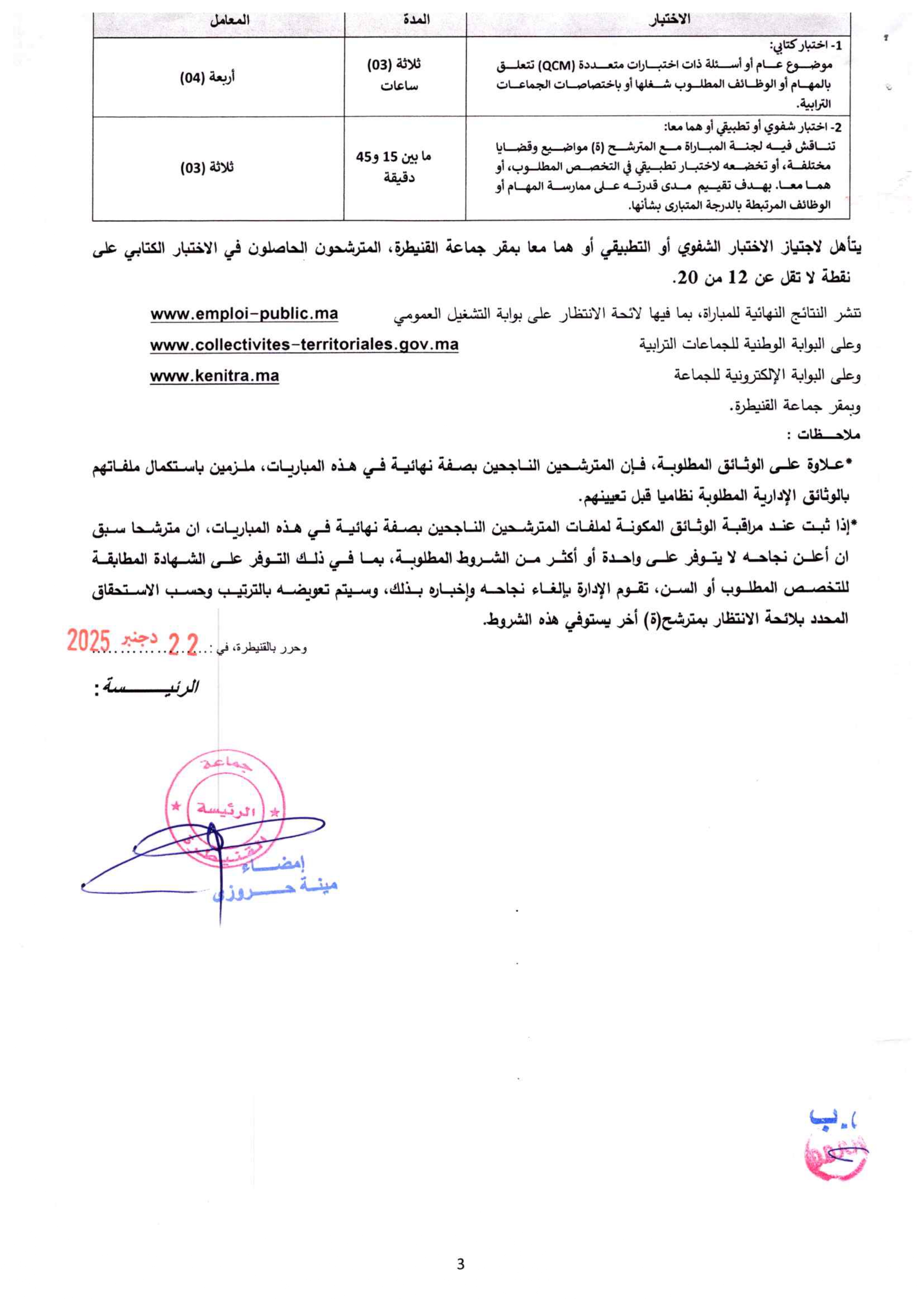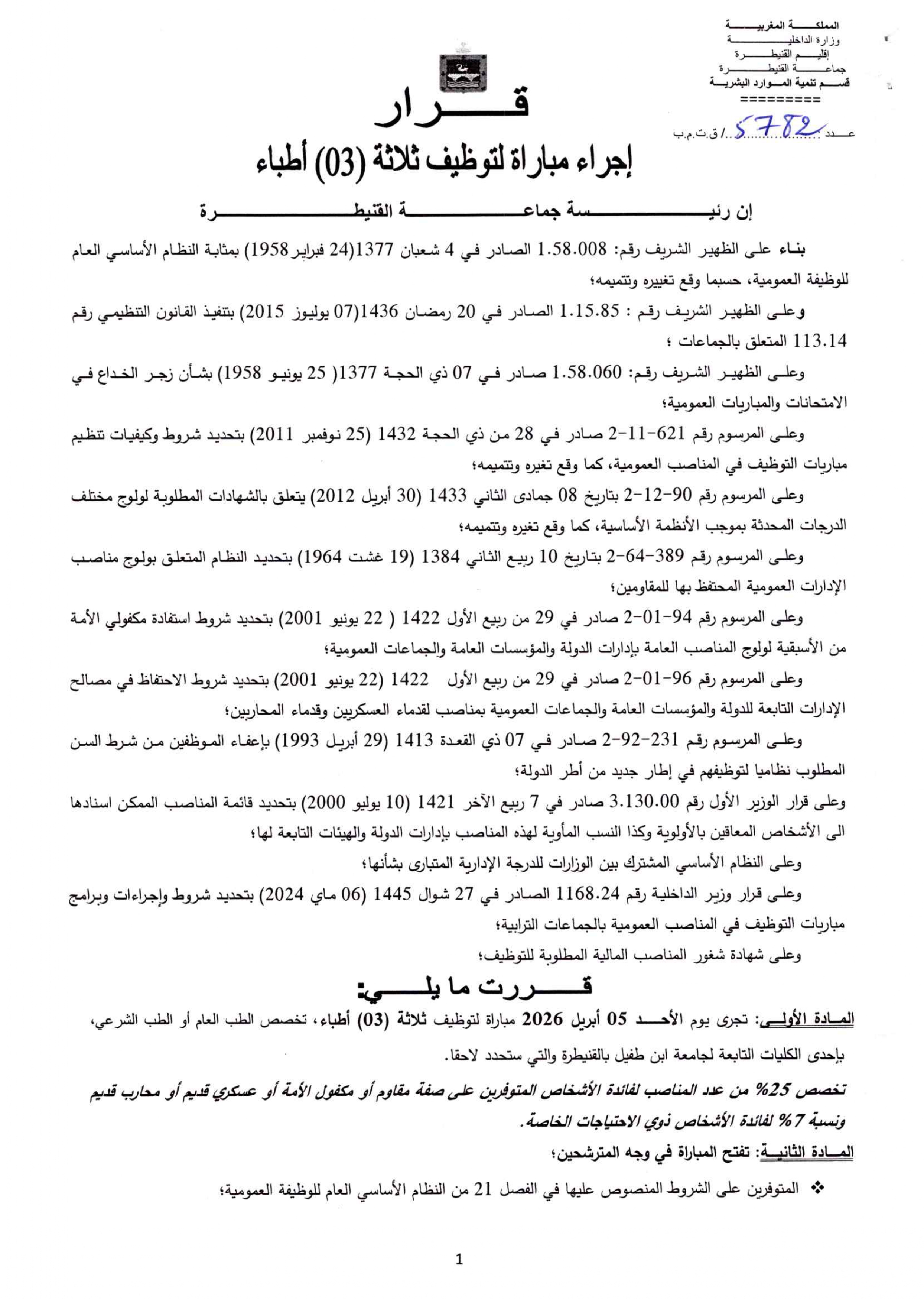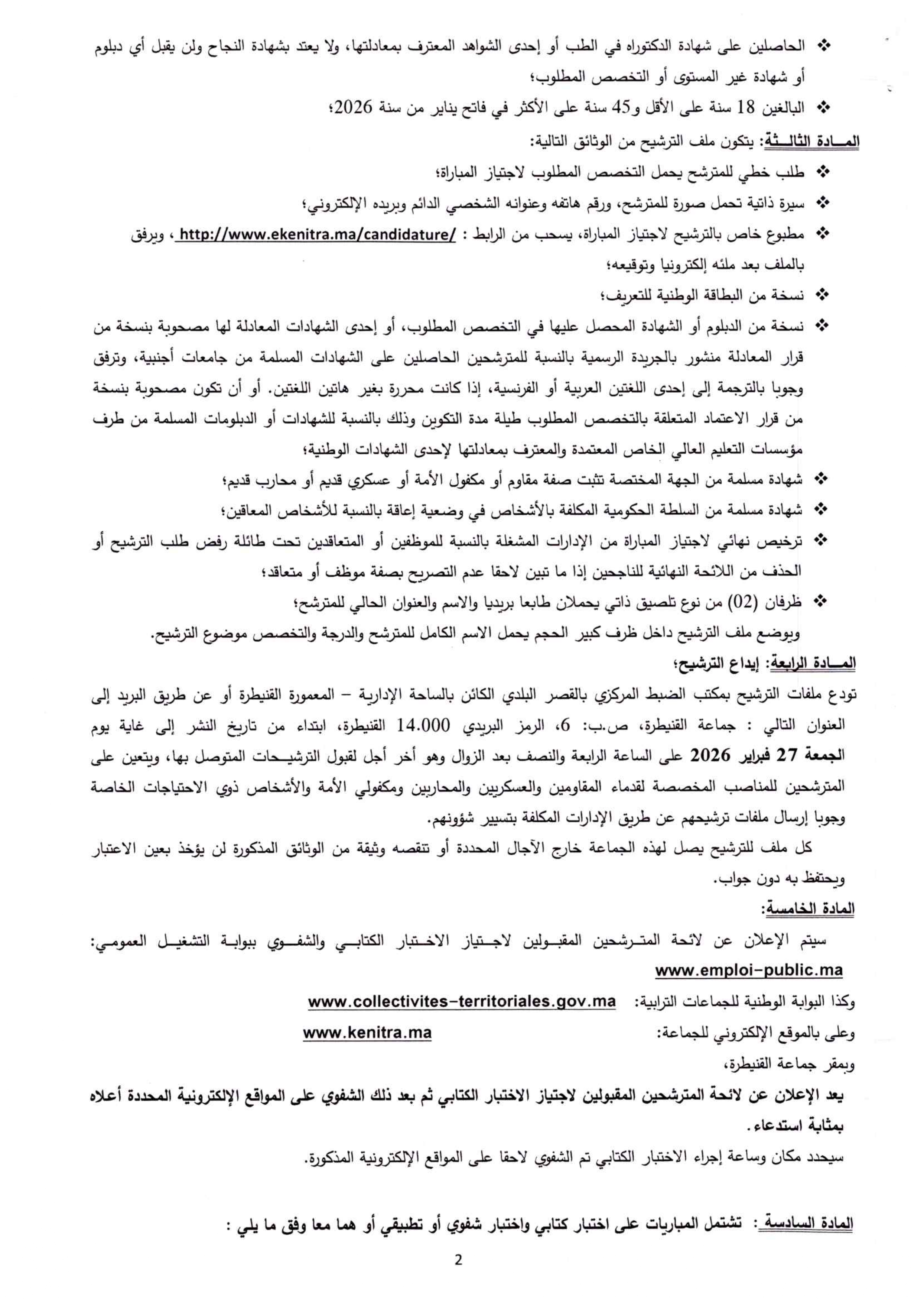 تعلن جماعة القنيطرة عن تنظيم مباراة لتوظيف ثلاثة (3) أطباء في تخصصي الطب العام أو الطب الشرعي.