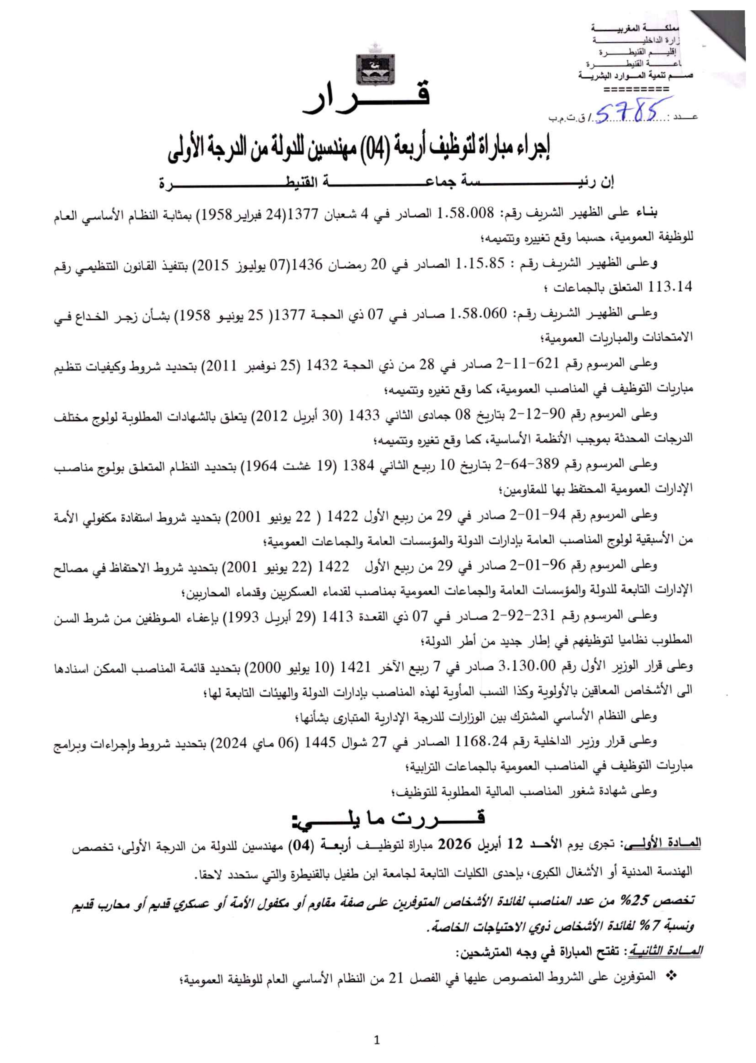 إعلان عن إجراء مباراة لتوظيف أربعة (04) مهندسين للدولة