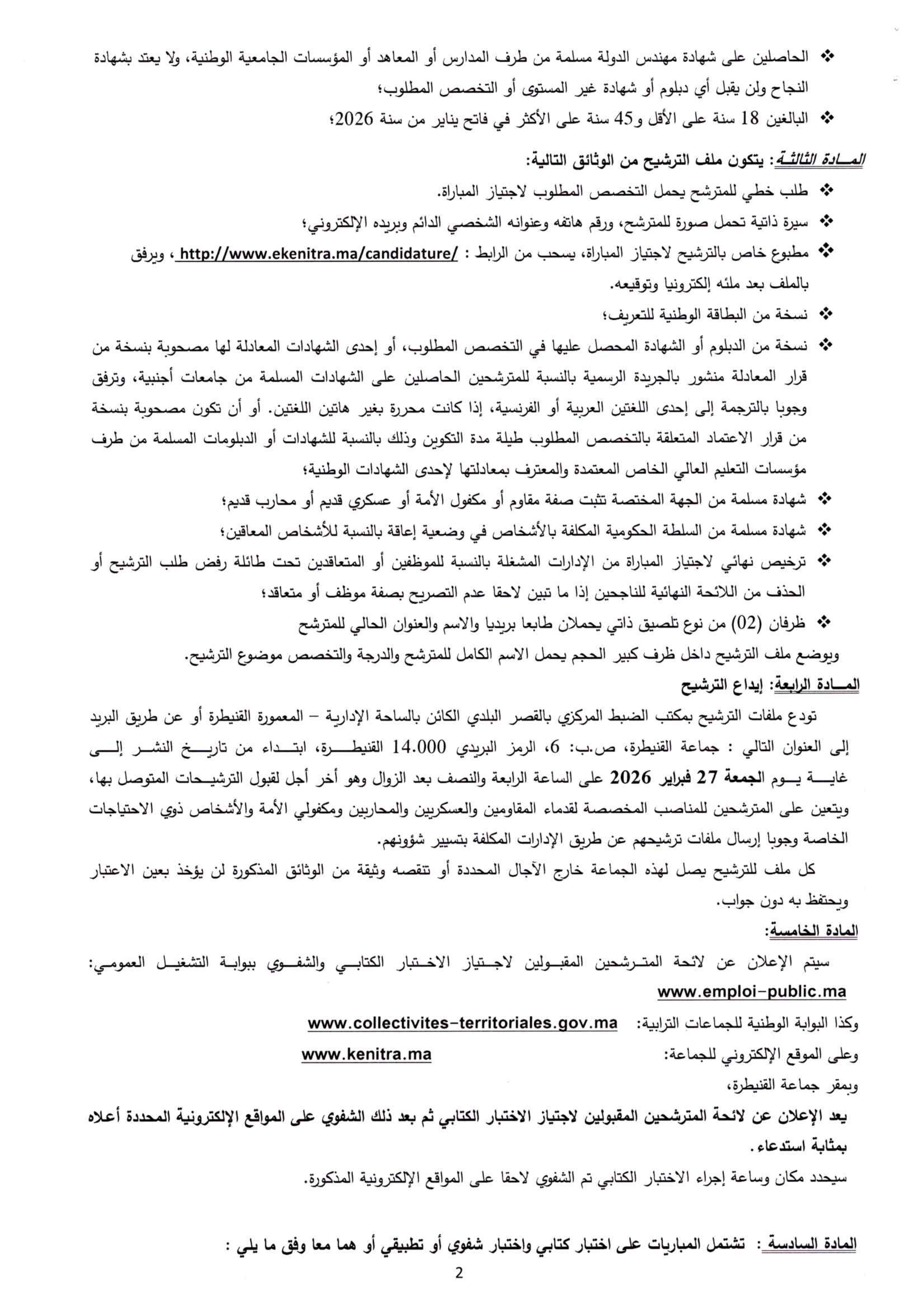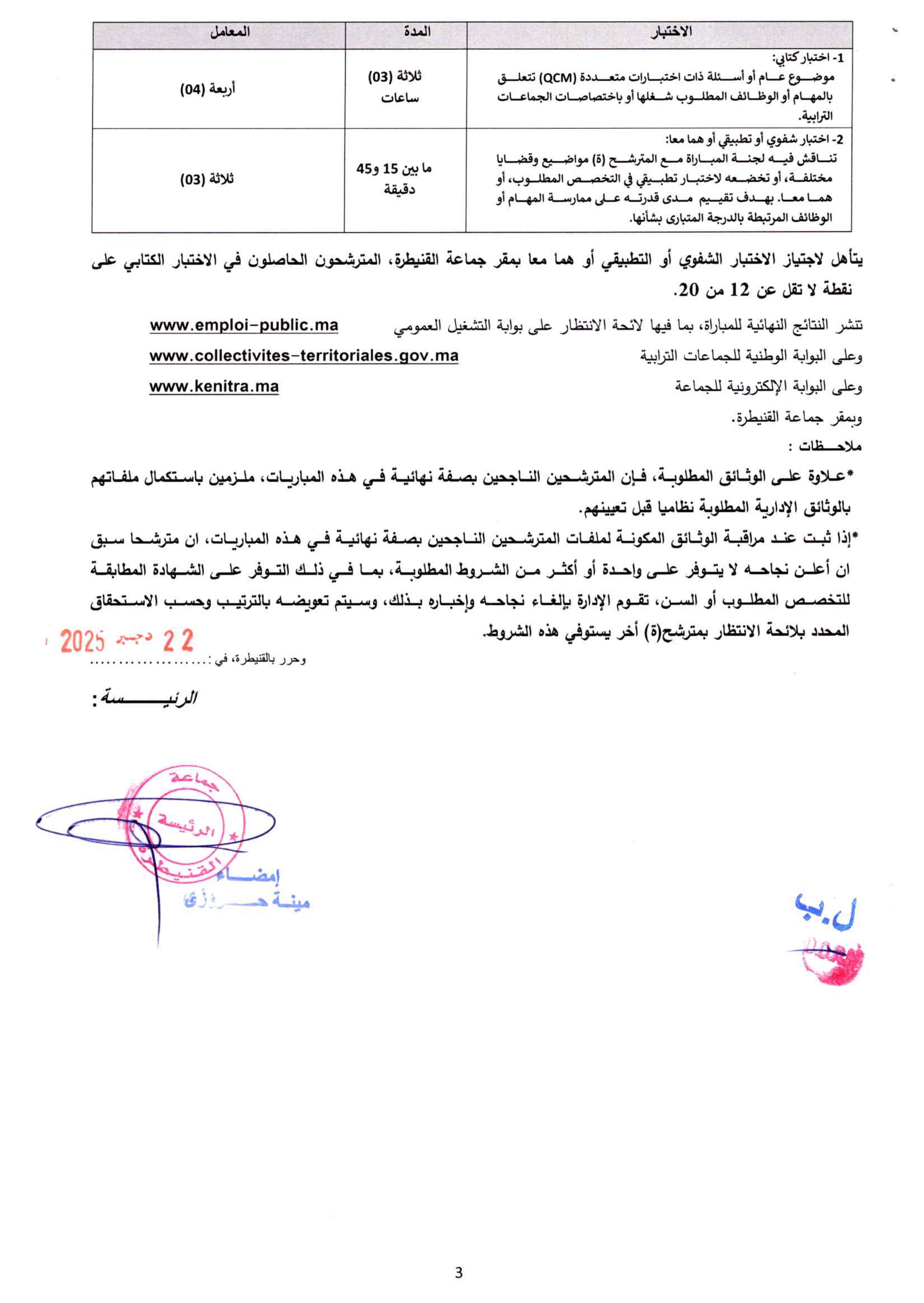 تعلن جماعة القنيطرة عن تنظيم مباراة لتوظيف أربعة (04) مهندسين للدولة من الدرجة الأولى، تخصص الهندسة المدنية أو الأشغال الكبرى.